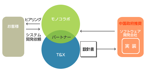 弊社の強力パートナーである、平塚にある株式会社T&Xが中国政府推奨のソフトウェア会社をネットワークを持っており、詳細な設計までを日本で行い、工数のかかる実装の部分を中国で制作します。これにより、日本の単価の半額〜に抑えることが可能です。